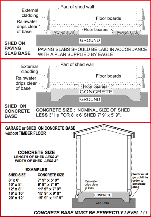 EAGLE sheds are designed to be erected on a firm level base, such a base will prolong the life of the shed and is essential if problems such as badly fitting doors and windows are to be avoided. Provided that the proposed site is earth, we can lay concrete paving slabs to form a suitable base.